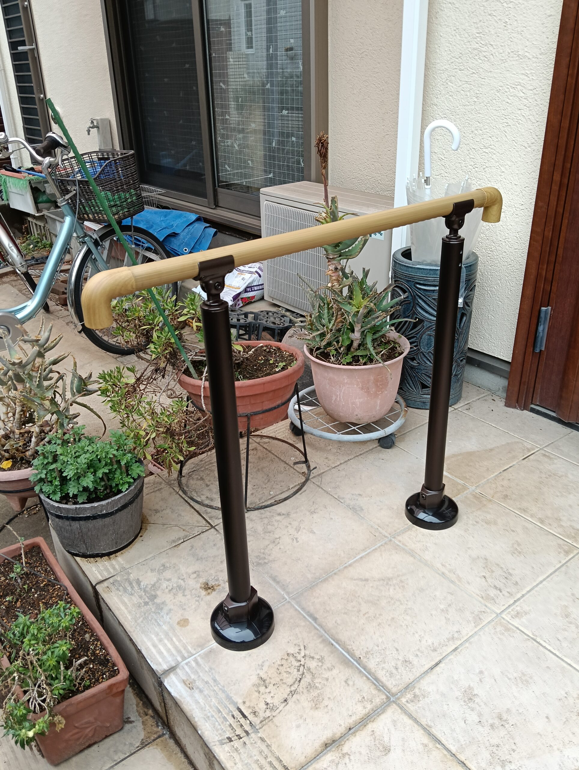 屋外手すりを取付させていただきました。 取りあえず、玄関前に1本だけのご要望。 手すりの中はステンレスで強化しています。 こちらで一安心とのこと。喜んでいただき、良かったです。 お気軽にご相談ください。